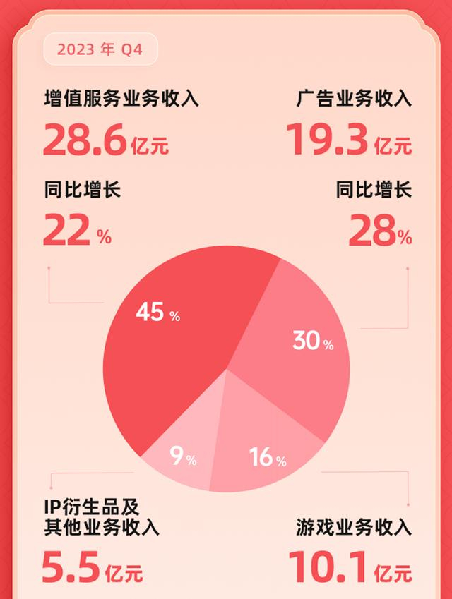 2023年,B站第四季度营收达63.5亿元,全年营收达225.3亿元。其中,广告业务收入增长亮眼,第四季度同比增长28%至19.3亿元,广告收入占整体收入比例由去年同期25%提升至30%,有效带动公司毛利润的提升。