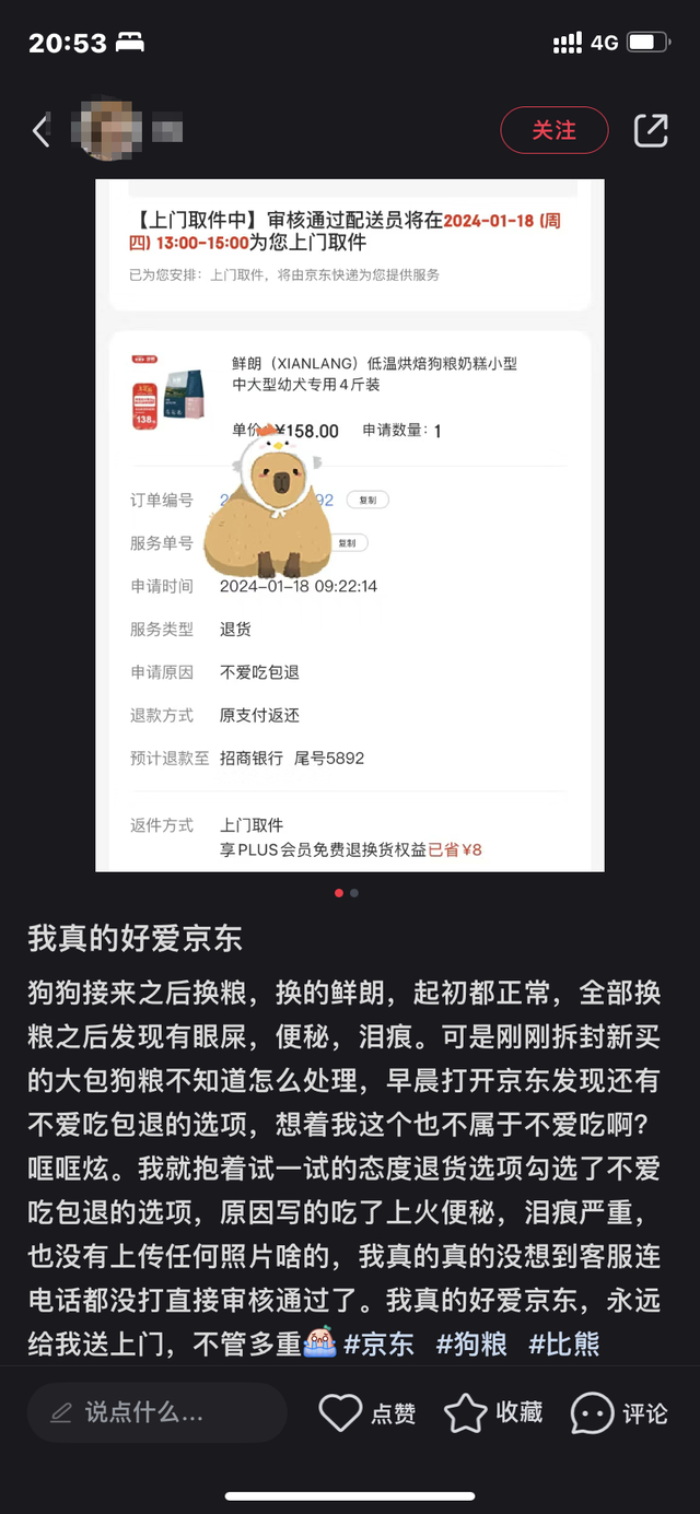 一直以来,消费者对于线上购买猫狗主粮的吐槽大多集中在“买了一大包,猫/狗吃了一口就不吃了,又没地方放,又舍不得直接扔”。而为了解决这一难题,京东超市首创“不爱吃包退”服务,以不会说话的宠物真实反应为核心,将宠物“不爱吃”作为提供售后服务的标准。