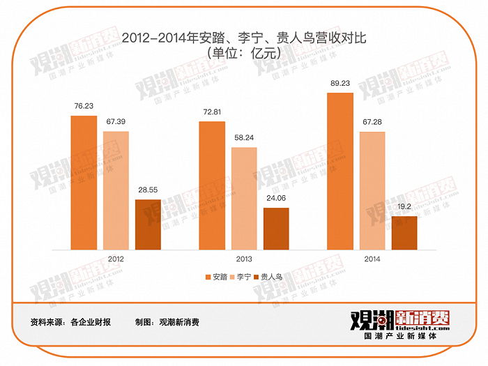 此外,2009年—2013年,贵人鸟市占率逐年下滑,分别为2.6%、1.9%、1.7%、1.5%、1.1%。