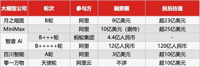 在投资月之暗面和MiniMax前,阿里分别投资了大模型创业公司智谱 AI 、百川智能和零一万物,其中对零一万物的投资是以阿里云的身份完成的。考虑到阿里云并没有完成拆分,可以理解为是阿里的投资。