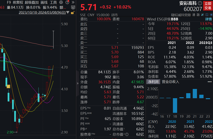 记者梳理发现,从2月6日起,安彩高科股价一路上涨,从最低2.90元/股,到3月8日收盘5.71元/股,上涨了近一倍,近6天更是收获4个涨停板。