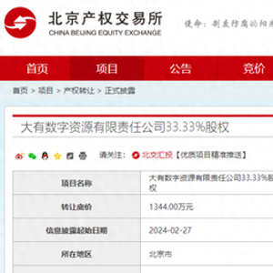 证券时报·e公司记者注意到,大有数字资源有限责任公司(下称“大有数字”)100%股权正被股东挂牌转让。