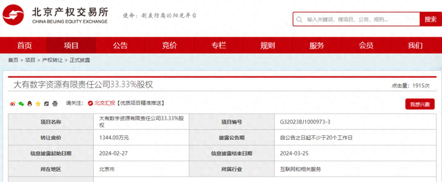 据北京产权交易所披露,大有数字三笔各33.33%股权于2月下旬挂牌,挂牌结束日为3月25日。三笔股权的转让底价均为1344万元,合计4032万元。三笔股权捆绑转让,如形成竞价,竞价起始价为三个项目挂牌价之和,溢价部分按照三个项目转让底价的比例进行分配。