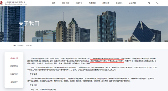 从企查查显示,大有数字持有大有国联控股100%股权。大有国联控股官网称,公司为大有数字旗下最大的综合协调与产业孵化平台,总资产规模近1000亿元,年营业收入近300亿元。大有国联控股业务包括乡村振兴、数字矿山、供应链物流、养老大健康、绿色环保五大板块和一个配套产业基金。“目前,公司正全力推进企业信用整体评级和项目公司上市工作。”大有国联控股称。
