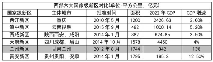 2022年,兰州新区GDP增速为13%,位居西部六大国家级新区中第一位,远超过重庆新区的3.6%、西安西咸新区的3.5%、成都天府新区的4%,这也是近6年来的常态。
