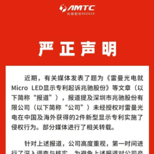 兆驰股份在声明中表示,公司从未从事任何侵犯他人知识产权的行为。公司董事长顾伟在接受《每日经济新闻》记者采访时表示,涉事专利并非雷曼光电独创,且两家公司在显示的布局方式上有差异。