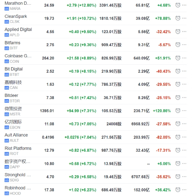 美数字货币概念股普遍上涨,MarathonDigital涨超11.5%,Bitfarms涨9.8%Applied Digital、CleanSpark、亿邦国际ADR至少涨约9.1%,数字货币交易所Coinbase涨超7.9%,Bit Digital和嘉楠利技 ADR涨超 7.7%,微策投资涨约 6.9%。
