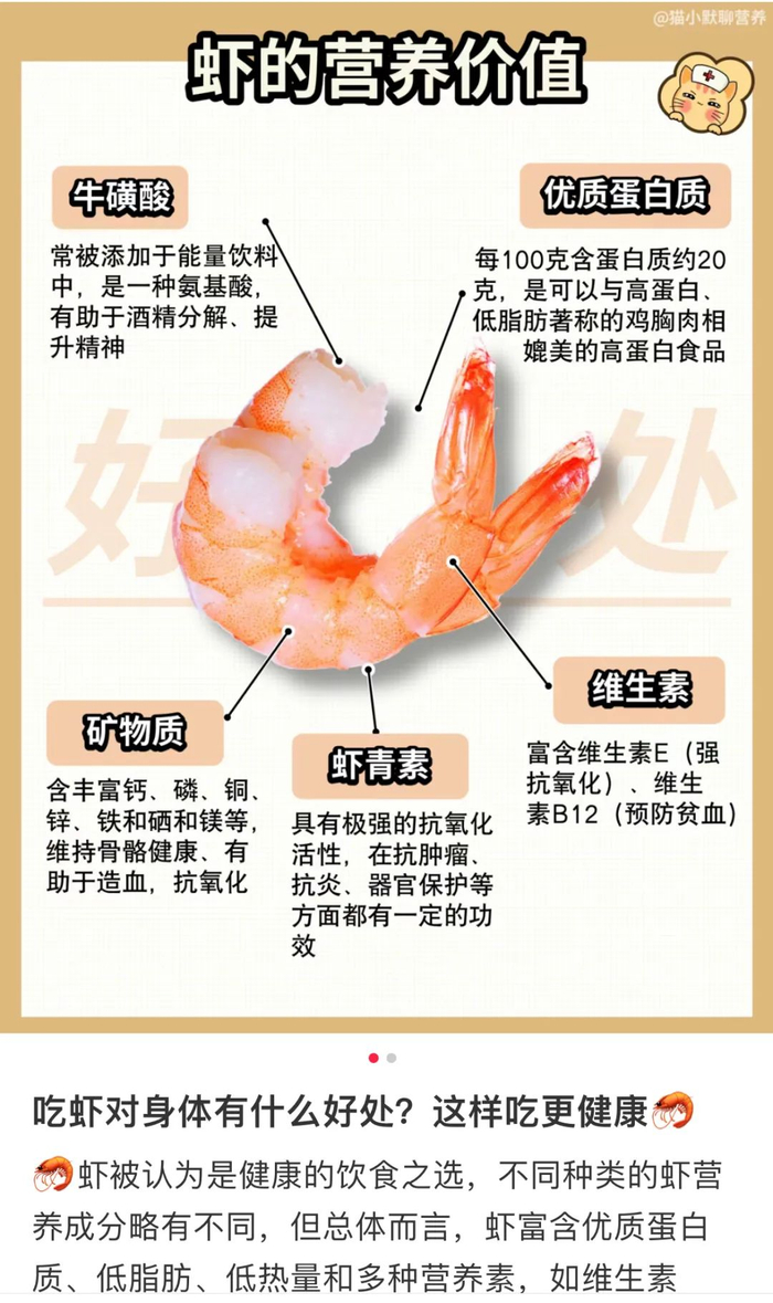 它富含优质蛋白,钙含量高,100g虾含有的钙当于300mL牛奶。