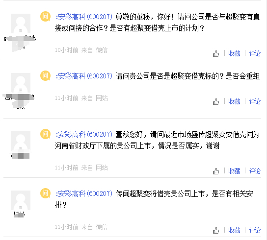 3月8日上午,有投资者到互动平台询问安彩高科,“公司是否与超聚变有直接或间接的合作?是否有超聚变借壳上市的计划?”彼时,公司并未有回应。