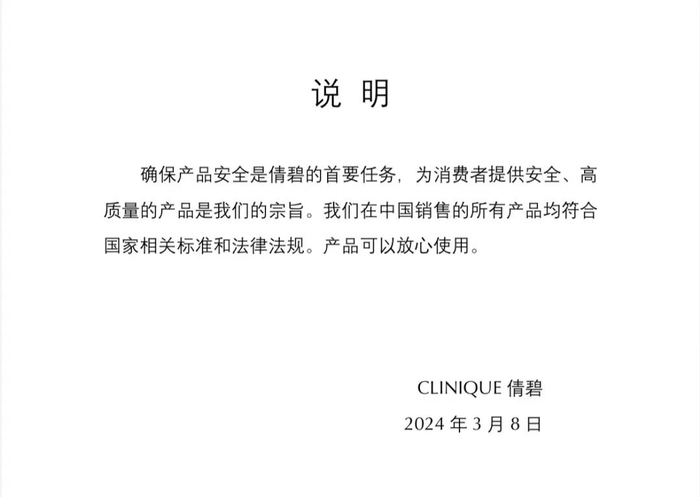 针对该检测结果,3月8日,雅诗兰黛旗下品牌倩碧回应表示:“确保产品安全是倩碧的首要任务,为消费者提供安全、高质量的产品是我们的宗旨。我们在中国销售的所有产品均符合国家相关标准和法律法规。产品可以放心使用。”