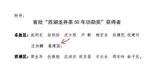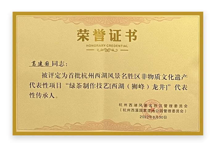 葛建国老师被评定为首批杭州西湖风景名胜区非物质文化遗产代表性项目“绿茶制作技艺[西湖( 狮峰 ) 龙井]”代表性传承人。