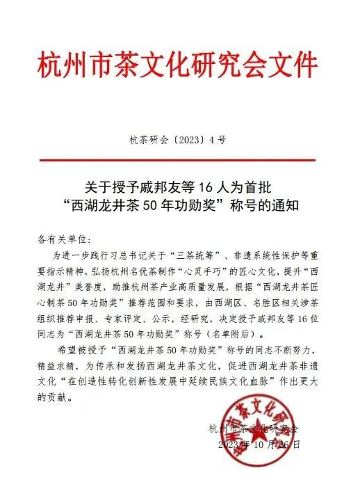 葛老师也有幸被聘为中国茶叶博物馆特约顾问、浙江大学茶学系客座教授。2023年,葛老师成功荣获杭州市茶文化研究会首批“西湖龙井茶 50 年功勋奖”!