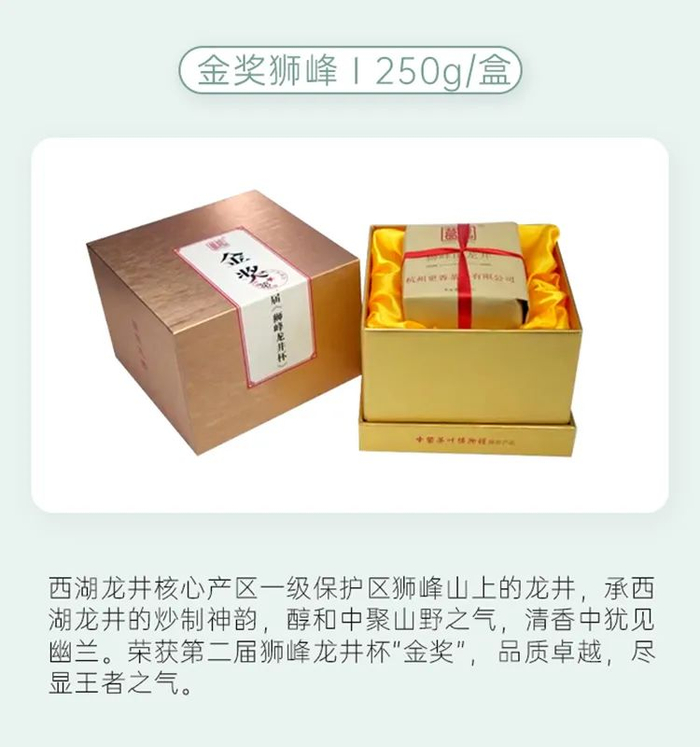 荣获第二届狮峰龙井杯“金奖”,品质卓越,尽显王者之气。