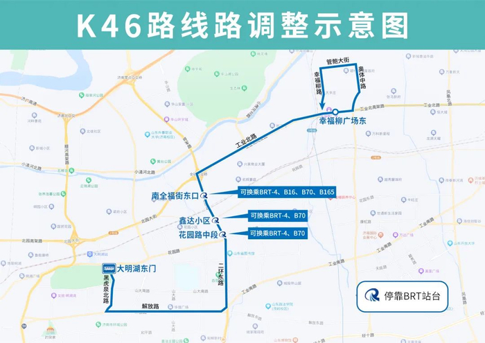 K46路由大明湖东门开往幸福柳广场东,调整后线路走向不变,在二环东路停靠花园路中段、鑫达小区、南全福街东口共3处路中公交站台,撤销路侧的二环东路花园路、鑫达小区、二环东路南全福街站点,其他途经站点不变。