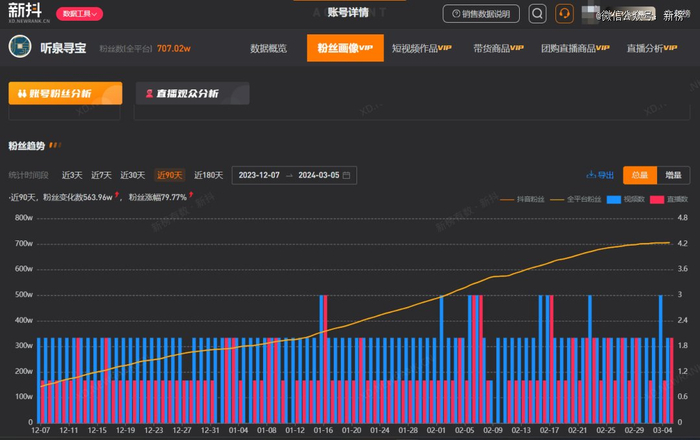 新榜旗下抖音数据工具新抖数据显示,“听泉寻宝”近三个月抖音直播累计场观超3.41亿,涨粉达550万;同时,他的直播切片在全网二次传播发酵,其B站账号“听泉鉴定”三个月涨粉超80万。