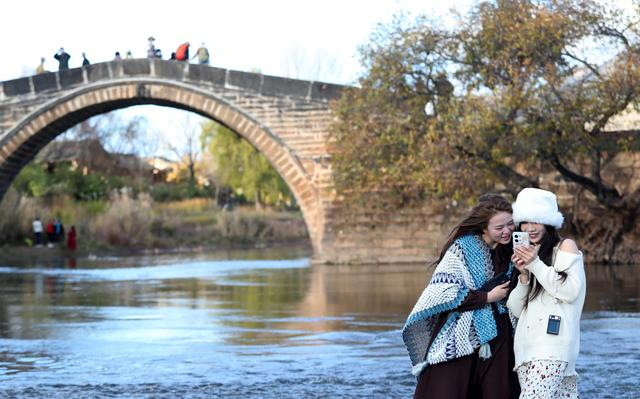 2023年12月9日,云南沙溪古镇,游人在玉津桥打卡旅拍。图据视觉中国