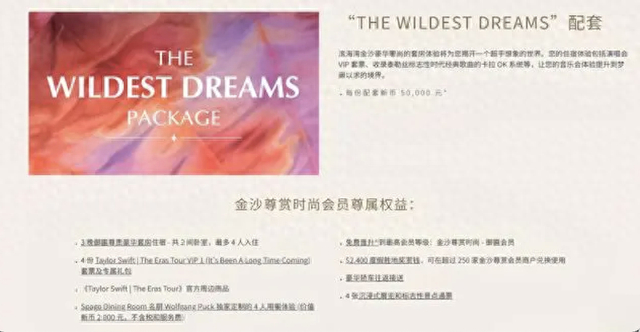 具体来看,新加坡当地的酒店已经推出了各类与“霉霉”演唱会相关的产品。公开信息显示,新加坡滨海湾金沙酒店特意为“霉霉”的时代巡回演唱会制作专属网页,推出“STAY STAY STAY”“SHAKE IT OFF”“THE WILDEST DREAMS”三项特别配套服务,将演唱会门票、周边产品、酒店的食宿、新加坡热门的门票以及往返景点的交通打包销售,价格从10000~50000元新加坡元不等,折合成人民币约为53553元到267705元。根据该酒店官网消息显示,目前三项服务已经全部售罄。