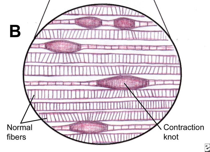 但损伤和炎症等,让一条条肌纤维由中间某段“紧绷挛缩”在一起,甚至复合形成了可以触碰到的结节。