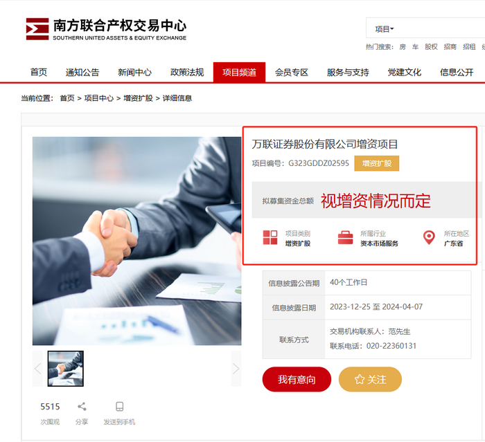 去年12月,南方联合产权交易中心网站披露了万联证券增资项目,万联证券拟增资不超过60亿元,其中控股股东广州金控拟出资不少于20亿元。记者注意到,截至目前,该吸引战略投资者的增资扩股计划仍在进行中。