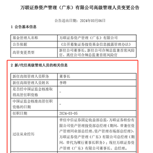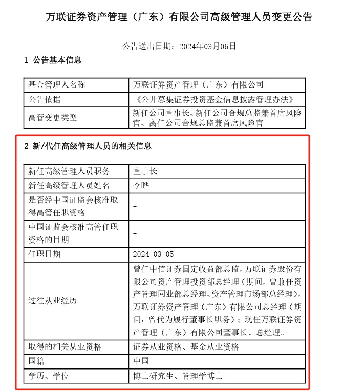 3月6日,随着一纸公告官宣,李晔正式“一肩挑”万联资管总经理和董事长职务。