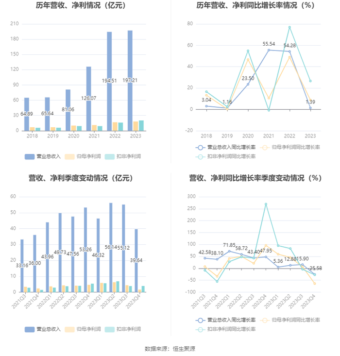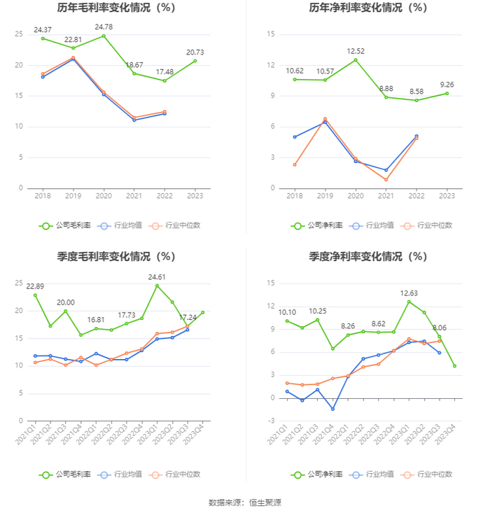 2023年,公司毛利率为20.73%,同比上升3.25个百分点;净利率为9.26%,较上年同期上升0.68个百分点。从单季度指标来看,2023年第四季度公司毛利率为19.75%,同比上升1.07个百分点,环比上升2.51个百分点;净利率为4.21%,较上年同期下降4.46个百分点,较上一季度下降3.85个百分点。