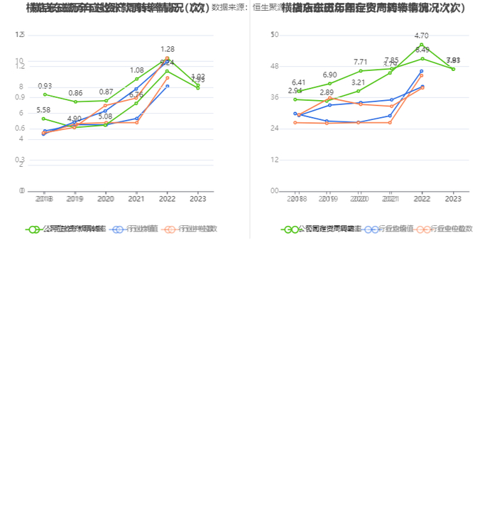 营运能力方面,2023年,公司公司总资产周转率为1.02次,上年同期为1.28次(2022年行业平均值为1.01次,公司位居同行业4/17);固定资产周转率为3.91次,上年同期为4.70次(2022年行业平均值为3.85次,公司位居同行业6/17);公司应收账款周转率、存货周转率分别为7.93次、7.83次。