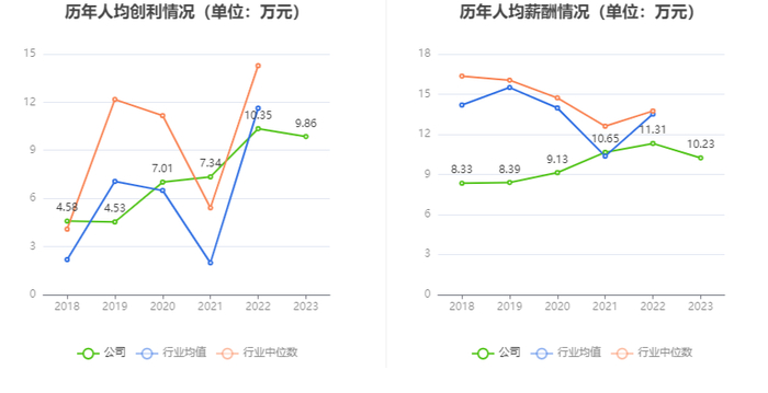 截至2023年末,公司员工总数为18416人,同比增加14.24%,人均创收107.09万元,人均创利9.86万元,人均薪酬10.23万元,较上年同期分别下降11.25%、4.76%、9.50%。