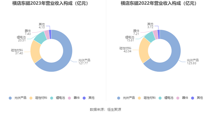 分产品来看,2023年公司主营业务中,光伏产品收入127.77亿元,同比增长1.47%,占营业收入的64.79%;磁性材料收入37.40亿元,同比下降11.03%,占营业收入的18.97%;锂电池收入20.51亿元,同比增长31.38%,占营业收入的10.40%;器件收入7.43亿元,同比增长3.03%,占营业收入的3.77%。