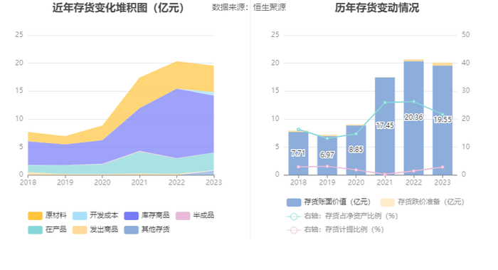 从存货变动来看,截至2023年年末,公司存货账面价值为19.55亿元,占净资产的21.71%,较上年末减少8143.2万元。其中,存货跌价准备为5741.72万元,计提比例为2.85%。