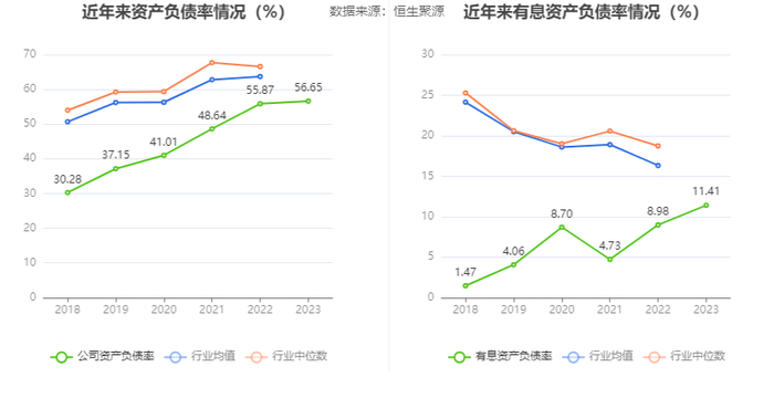 在偿债能力方面,公司2023年年末资产负债率为56.65%,相比上年末上升0.78个百分点;有息资产负债率为11.41%,相比上年末上升2.43个百分点。