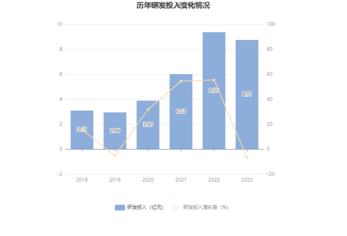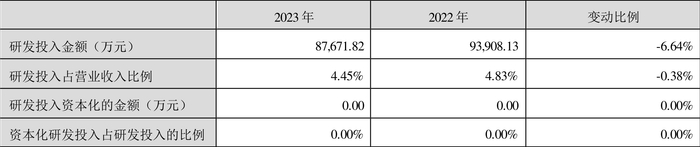 2023年全年,公司研发投入金额为8.77亿元,同比下降6.64%;研发投入占营业收入比例为4.45%,相比上年同期下降0.38个百分点。此外,公司全年研发投入资本化率为0。