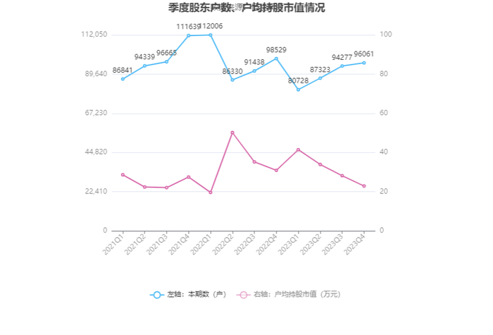筹码集中度方面,截至2023年年末,公司股东总户数为9.61万户,较三季度末增长了1784户,增幅1.89%;户均持股市值由三季度末的28.19万元下降至22.93万元,降幅为18.66%。
