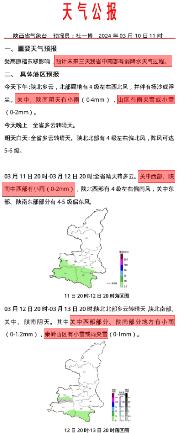 未来0-6小时:全省阴天,延安南部、关中大部、汉中、安康、商洛大部有小雨(0.1-3.9mm),宝鸡南部和西安西部局地有中雨(4-6mm)。陕北局地有4级左右偏北风,局地阵风可达6级以上,榆林北部伴有浮尘或扬沙。