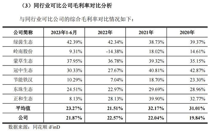 招股书显示,2023年上半年、2021年度及2020年度华艺园林的综合毛利率分别为21.87%、22.04%和19.84%,均低于行业平均值23.27%、32.17%、21.01%。“安徽区域内竞争激烈,许多地区采取‘有效最低价规范性评审法’作为招投标的评标办法,在此环境下公司许多项目在招投标过程中以较高下浮率中标,导致公司业务整体毛利率略低于同行业可比公司。”公司表示。