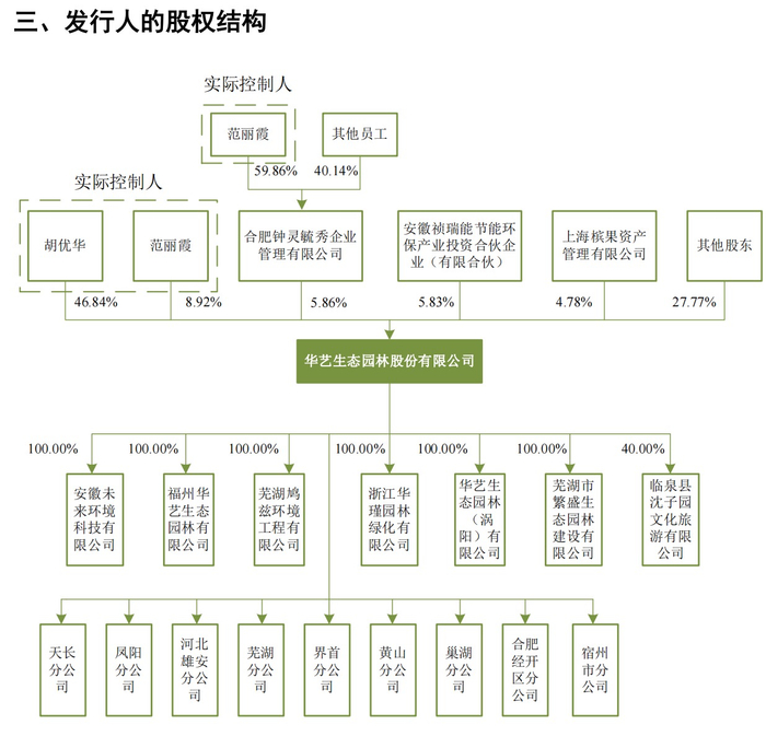 截至招股书签署日,胡优华持有华艺园林46.84%的股份,任公司董事长、总经理;范丽霞直接持有8.92%的股份,并通过员工持股平台合肥钟灵毓秀企业管理有限公司间接控制公司5.86%的股份。二人合计控制公司61.62%的股份。胡优华、范丽霞夫妇对公司决策具有决定权,为公司的实际控制人。
