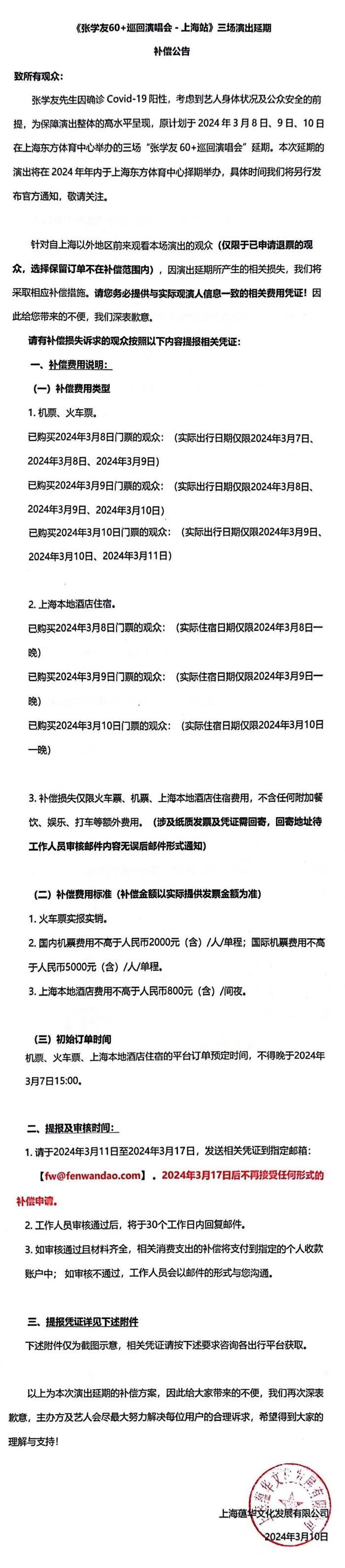 官宣!张学友演唱会延期举行,将补偿住宿和车票损失,方案公布
