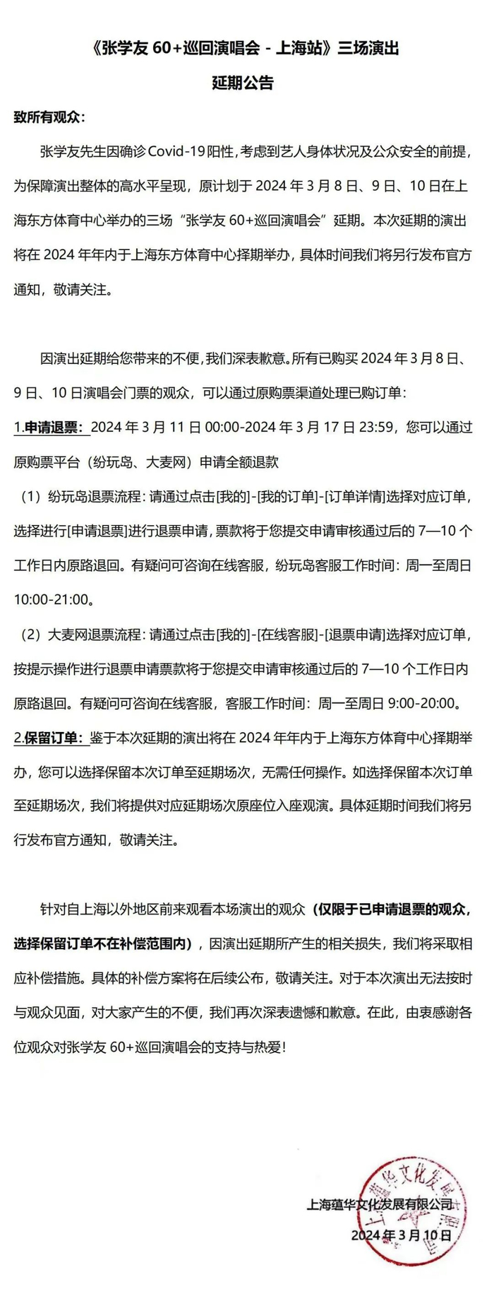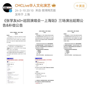 3月10日,主办方@CMCLive华人文化演艺 发布延期公告及补偿方式, 称本次延期的演出将在2024年年内于上海东方体育中心择期举办。