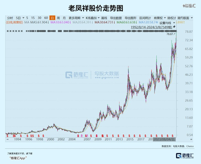 有意思的是,这个作为在市场几乎默默无闻的珠宝商,竟然在历史长跑中,尽管几经牛熊大波动,但到最后竟然跑出了比很多所谓成长股都靓丽得多的涨幅。拉长时间看,从2005年7月19日统计至今,老凤祥的复权股价累计上涨了接近40倍。