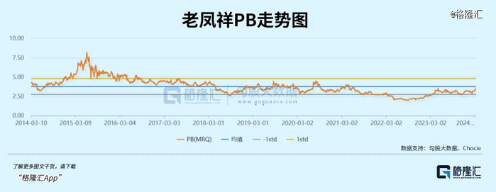 再看老凤祥估值,最新PB为3.57倍,回到过去10年估值中位数水平,也并不算明显估值泡沫。