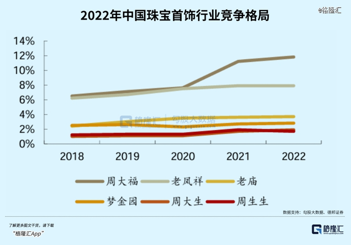 从这个维度看,主营黄金首饰的企业龙头将更为受益。在中国,老凤祥2022年市场占有率为7.9%,低于周大福的11.8%,又要远高于周大生、周生生、梦金园等品牌。