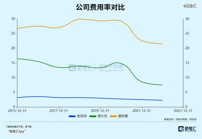 一方面是由于营收规模持续膨胀,相关费用率有规模平摊效应。另一方面,职业经理人和股权结构持续优化,驱使着管理层有意持续推动降本增效。从同行对比看,老凤祥比周大生、周大福明显要低很多。
