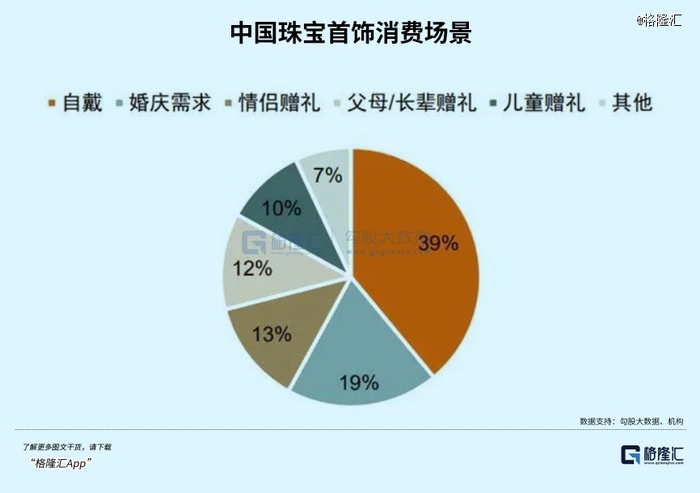 虽然这些年结婚消费珠宝首饰的需求持续走弱,但悦己自戴需求持续上升。据世界黄金协会2022年7月调查结果显示,自戴需求占比高达39%,其次才是婚庆,占比19%。