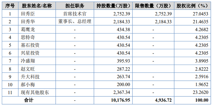东方智汇前十名股东中,除田秀臣、田秀华外,其余8位分别为葛鹰龙、思特奇、基石投资、兴星投资、冷盛翔、赵文旺、升大科技、郝小梅,持股比例分别为4.27%、4.23%、4.23%、4.23%、3.89%、2.82%、2.59%、1.97%。