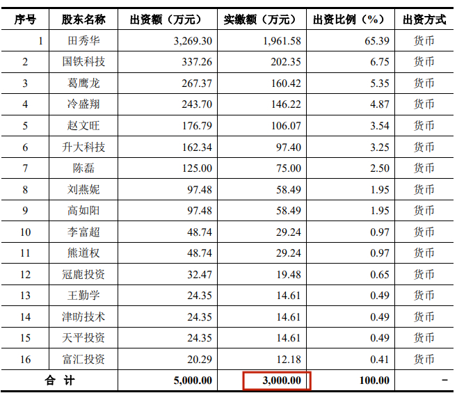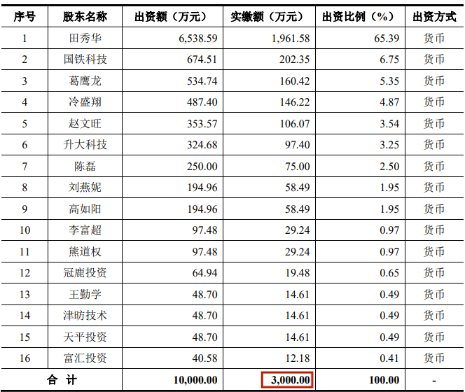 2002年底,还在通号院工作期间,田秀臣出资33万元参与成立了世纪东方的前身“北京世纪东方国铁电讯科技有限公司”。