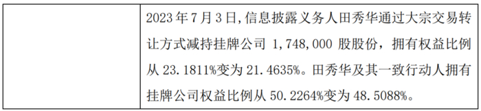 另据瑞财经《预审IPO》发现,同于2023年7月,东方智汇董事长、总经理田秀华通过大宗交易的转让方式减持了东方智汇174.8万股股份。