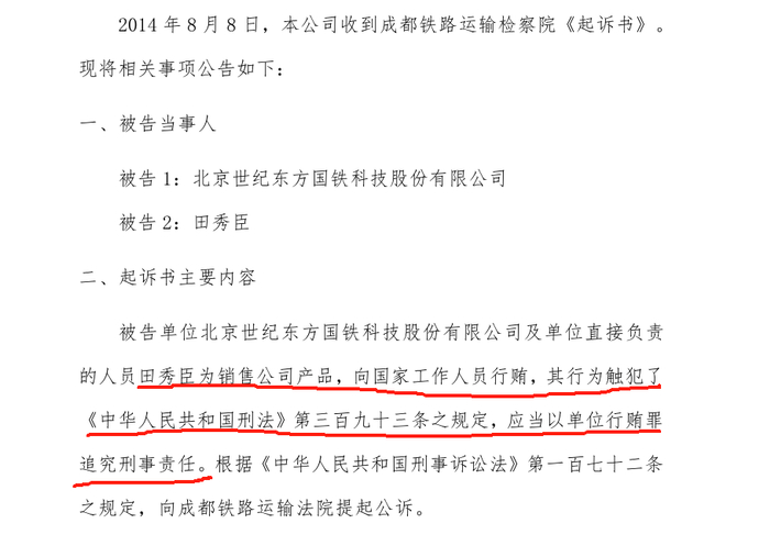 次年8月,世纪东方的一则公告再次惊动了资本市场。该则公告显示,为销售公司产品,世纪东方及单位直接负责人田秀臣向国家工作人员行贿,触犯了《中华人民共和国刑法》第三百九十三条之规定,应当以单位行贿罪追究刑事责任。