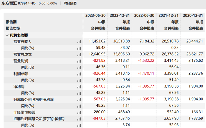招股书显示,2020年-2022年及2023年1-6月(以下称“报告期”),东方智汇的营收分别为2.84亿元、2.85亿元、3.65亿元及1.15亿元;归母净利分别为1737.69万元、3190.38万元、3225.94万元及-567.03万元。