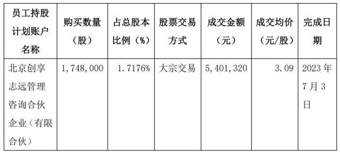 2023年7月3日,创享志远通过全国股转系统大宗交易平台完成了174.8万股股票的购买,交易价格仅为3.09元/股,总价为540.1万元。自此,此次员工持股计划实施完成。
