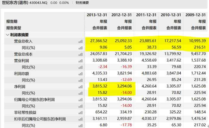 登陆新三板后,2009年-2011年,世纪东方的业绩一直保持着增长的态势,营收分别为1.1亿元、1.72亿元、2.39亿元。但2012年,其营收仅增长了5%至2.51亿元,净利则下滑了14%至3294.06万元。次年,净利虽有所上涨,但仍未回到2011年的水准。