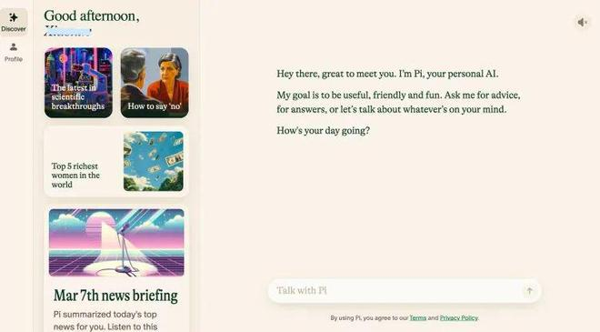 “Pi就是这种个人AI伴侣,唯一使命是让你更快乐、更健康、更高效。”